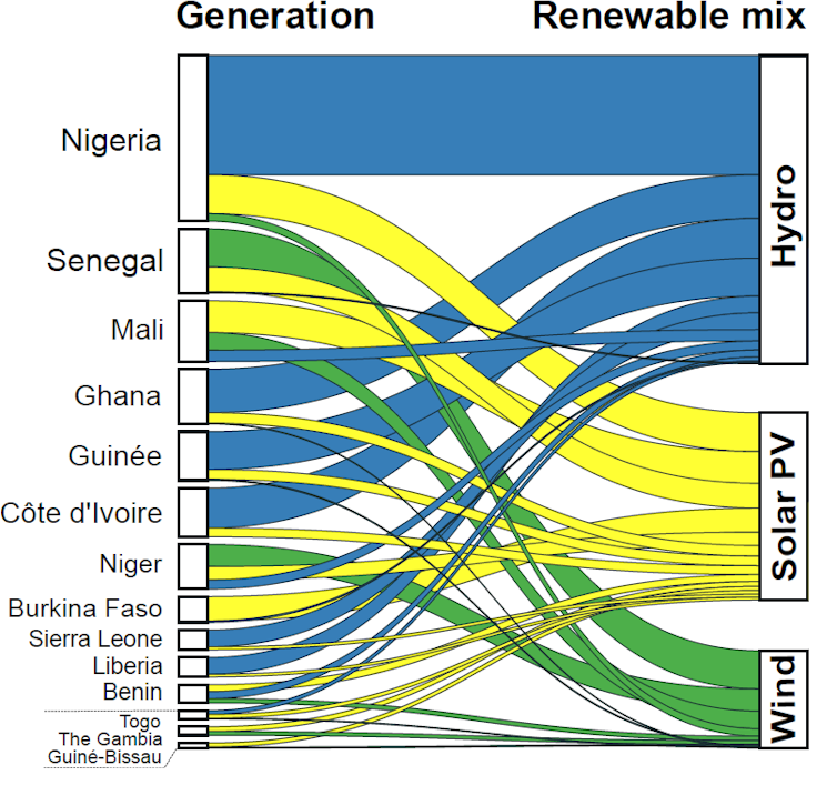 Les pays d’Afrique de l’Ouest ont des potentiels d’énergie renouvelable différents. Le potentiel solaire existe presque partout, tandis que le potentiel éolien est plus élevé le long des zones côtières et dans la partie nord, plus sèche, de la région. Le potentiel hydroélectrique est quant à lui surtout concentré dans la partie sud de la région, qui reçoit le plus de précipitations.