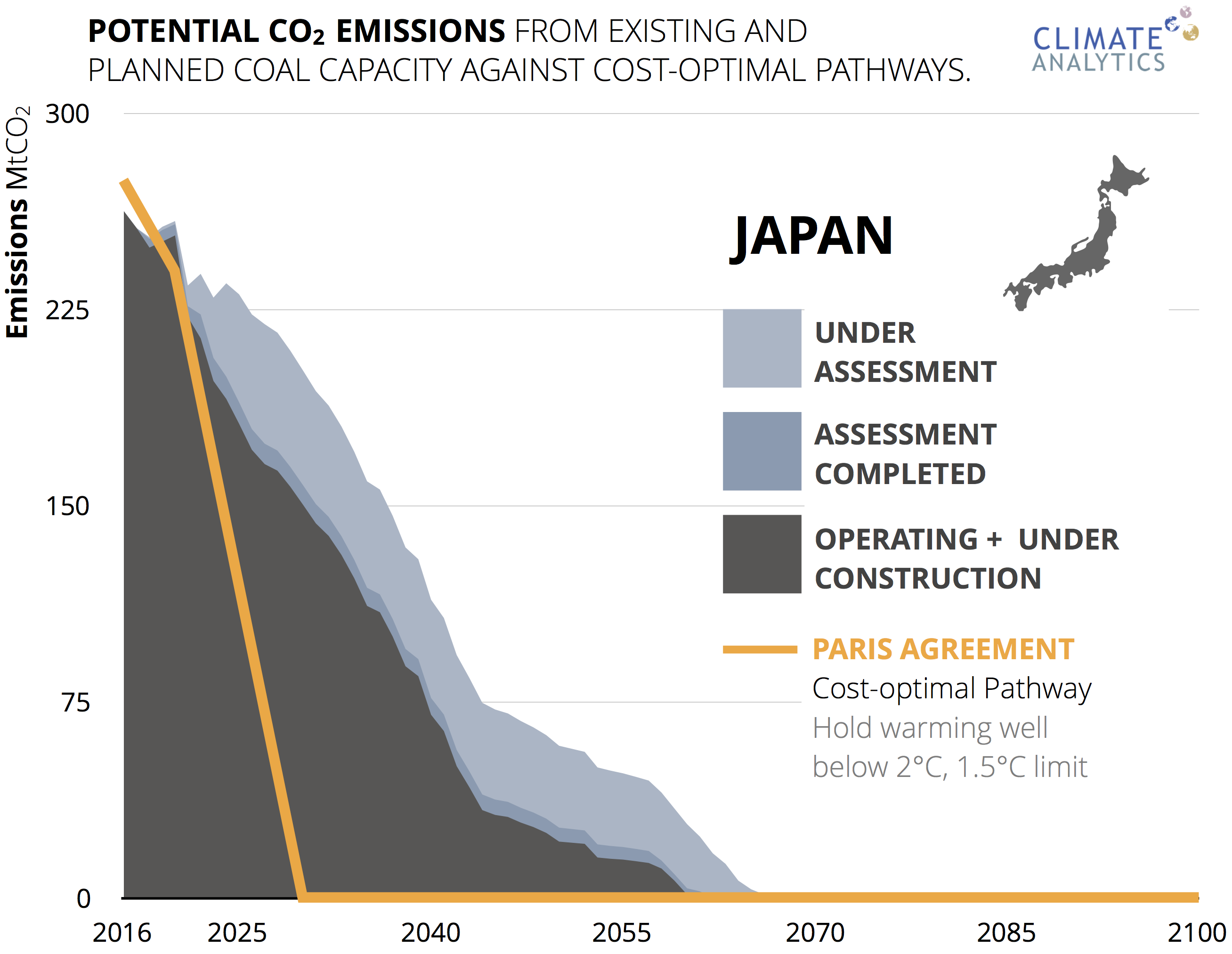 The report finds that Japan’s current policies and plans for new coal-fired power generation would result in levels of carbon pollution almost three times what is consistent with the Paris Agreement between now and 2050. This would create a significant risk of stranded assets and loss of competitiveness for Japanese investors.