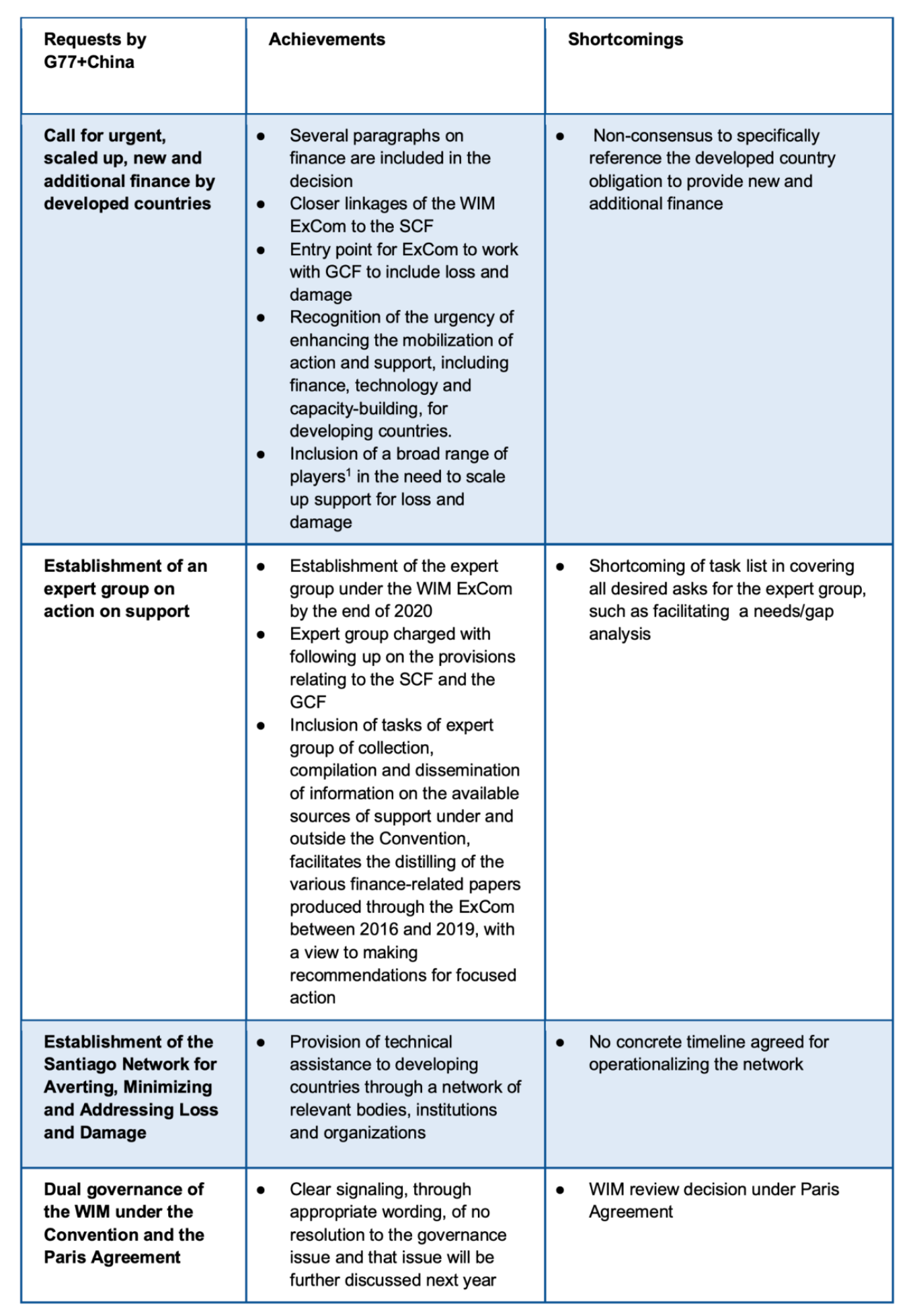 The table below illustrates the G77 & China “asks” against the actual outcomes of the review process, along with possible shortcomings of those outcomes. While there was consensus that finance for loss and damage must be scaled up, this was reflected only in broad provisions (that are, de facto, inclusive of developed countries, private sector, NGOs, other stakeholders), but are not specifically directed at the obligation of developed countries to do so. There was also no consensus to include wording around “new and additional” financing for loss and damage , though there was recognition of the “urgency of enhancing the mobilization of action and support”, including finance, technology and capacity-building, for developing countries.