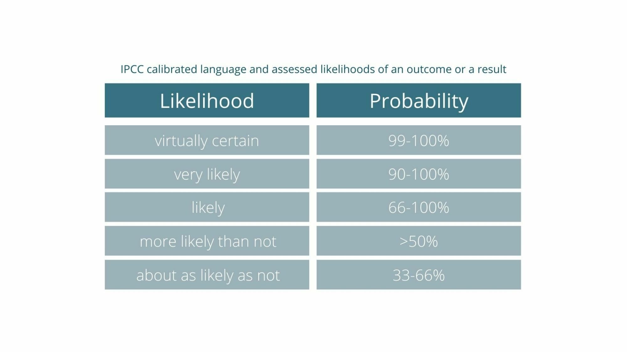 A higher than 66% likelihood is what the IPCC calls a likely outcome. The next threshold in IPCC language is very likely, which denotes a higher than 90% likelihood. And then there is the toss of a coin – a 50% likelihood that is called ‘more likely than not’.