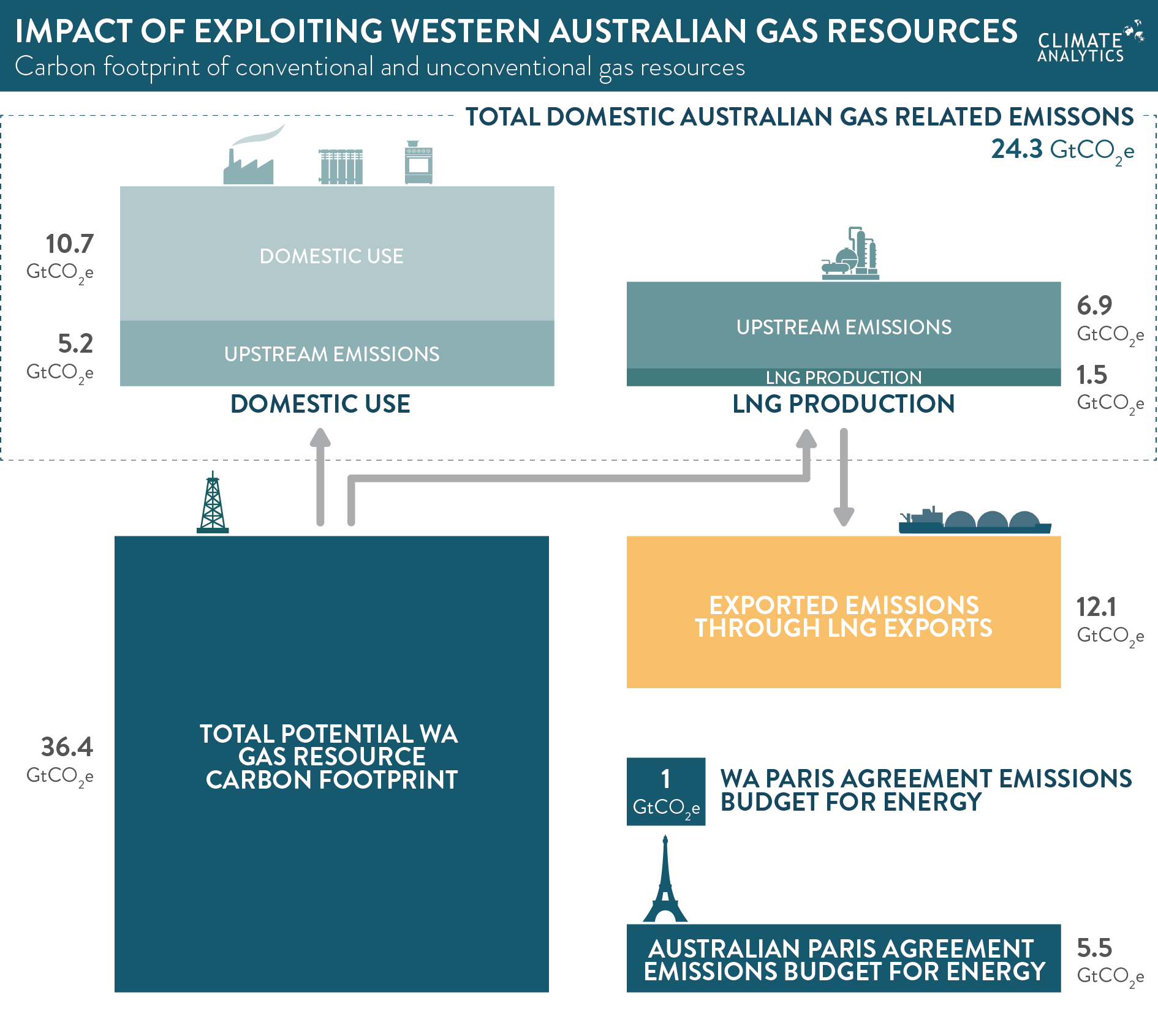 - The total upstream and direct emissions from use of all unconventional resources is about three times Australia’s estimated emissions budget under the Paris Agreement, which is 5-6 billion tonnes of CO2 equivalent (5.5 GtCO2).
