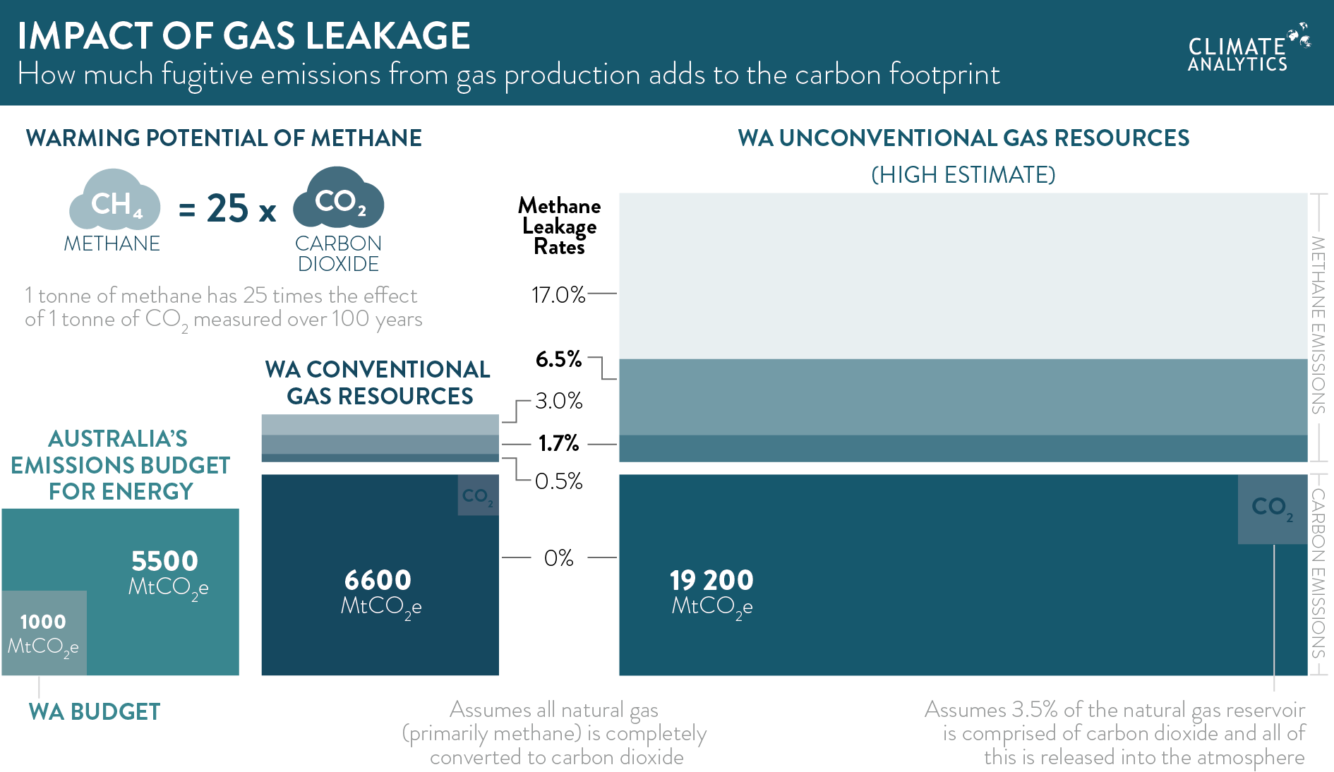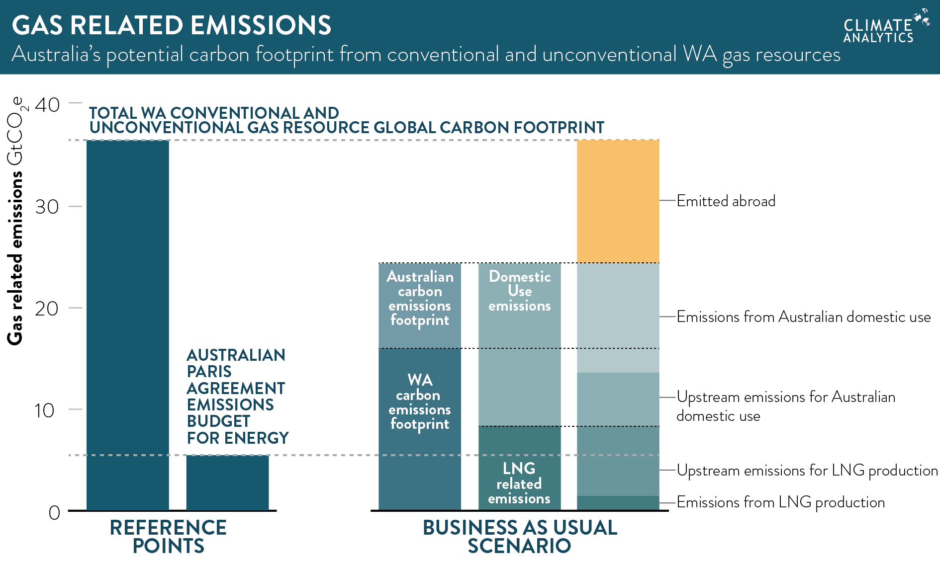 - Western Australia’s conventional gas reserves have a carbon footprint equivalent to about 1.3% of the global carbon budget under the Paris Agreement.