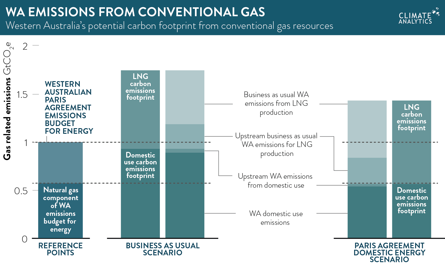 - Total domestic carbon footprint of conventional gas reserves is about 1.8 billion tonnes of CO2 equivalent emissions (1.8 GtCO2e). This is about 800 million tonnes above the Paris Agreement-compatible emissions budget for Western Australia, which is one billion tonnes of CO2 equivalent (1 GtCO2e). This budget is for the whole energy sector including power, industry, transport and buildings, not just those parts that depend on natural gas.