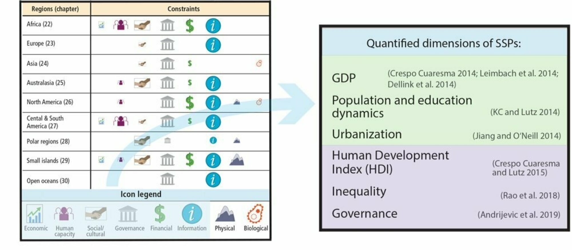 The figure below shows how these constraints can be combined with the data available in the SSPs. Integrating these “dimensions” can represent a way forward for a representation of adaptive capacity.