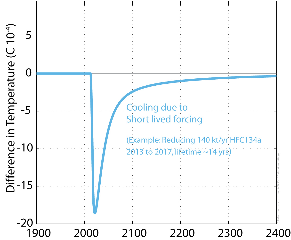 If emissions of a short-lived greenhouse gas are reduced, this will reduce warming for several decades (blue line). The cooling effect diminishes in time, because the emissions would have been removed naturally after a few decades anyway, which is the reason why such gases are called short-lived.