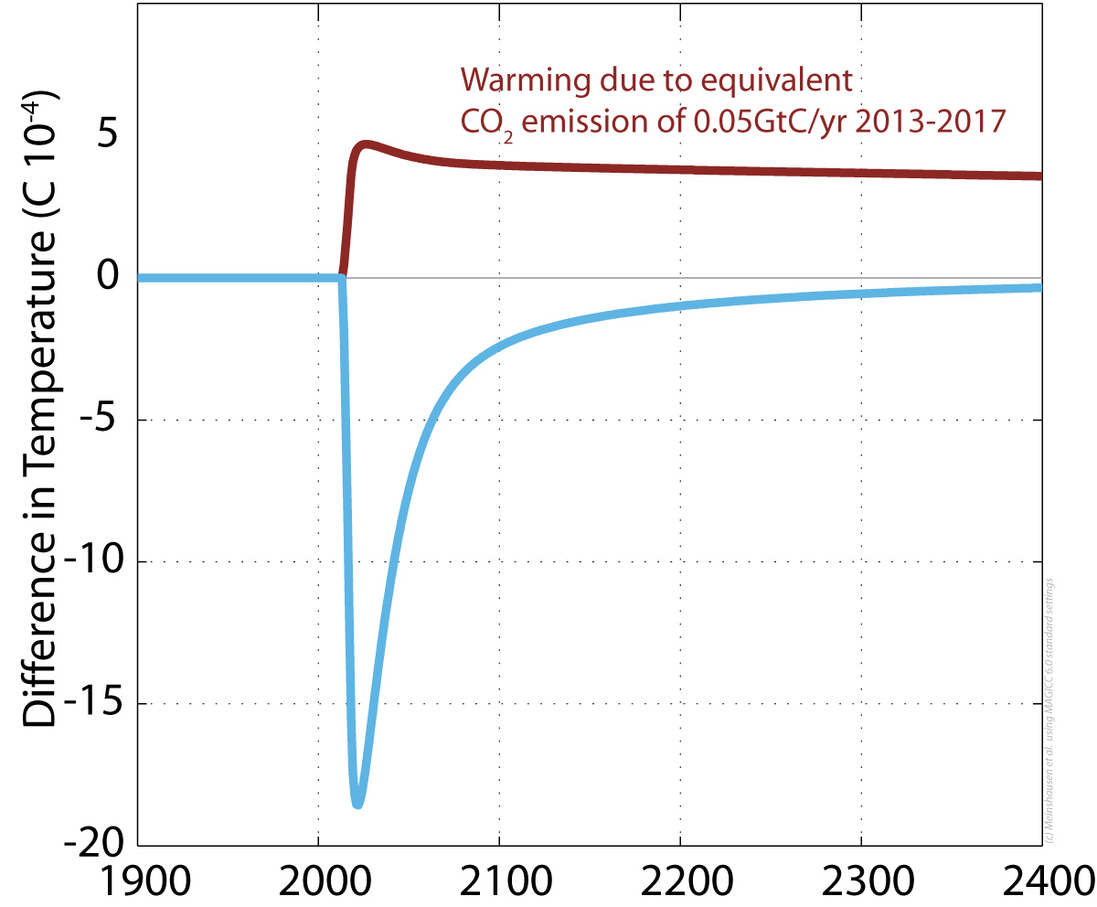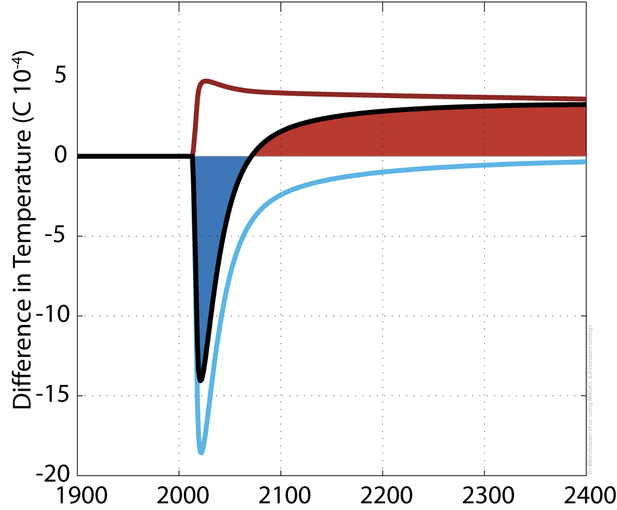 If that short-lived greenhouse gas reduction is achieved INSTEAD of reducing an amount of CO2, equal in terms of 100-year GWP-weighted emissions, this missed opportunity to reduce CO2 will raise temperatures for many hundreds of years (red line).